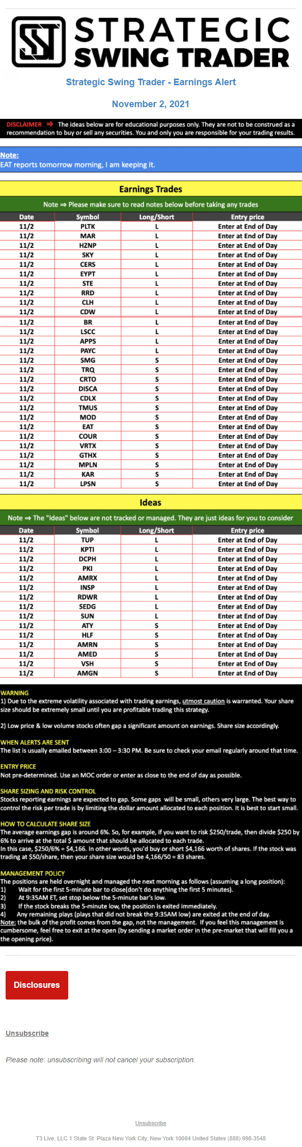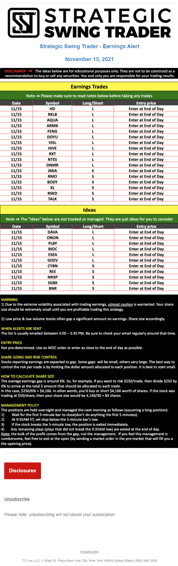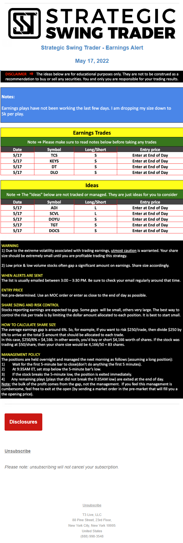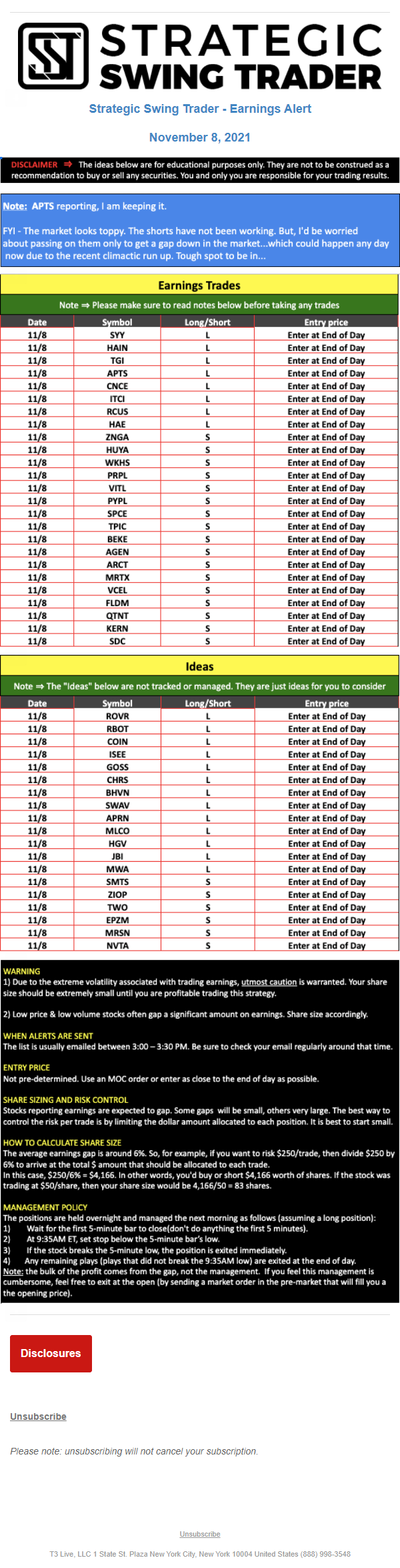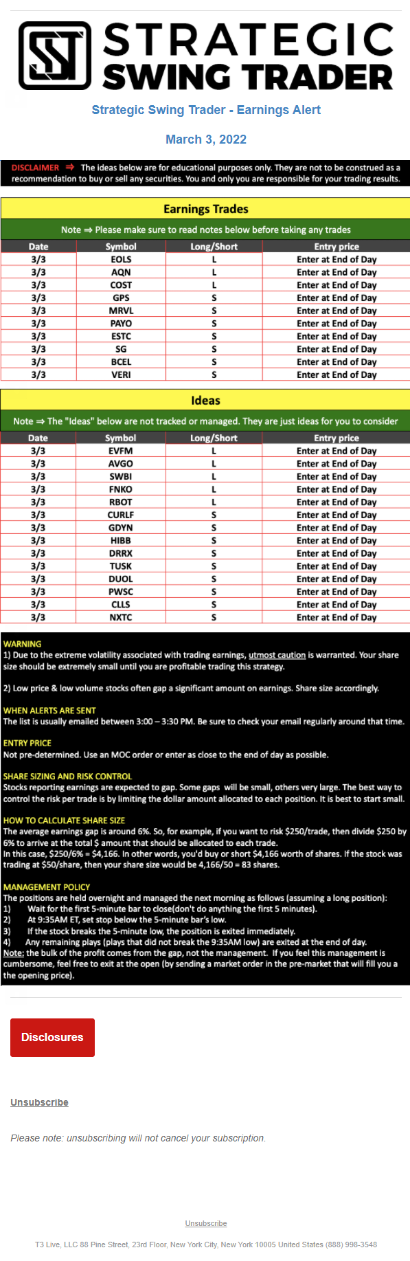 T3 Live, LLC is a financial publisher that disseminates information about economic, business, and capital markets issues through various media. T3 Live is not a Broker-Dealer, an Investment Adviser, or any other type of business subject to regulation by the SEC, CFTC, state securities regulators or any “self-regulatory organization” (such as FINRA). Although T3 Live and T3 Trading Group, LLC are affiliated companies by virtue of common ownership, the companies are managed separately and engage in different businesses.