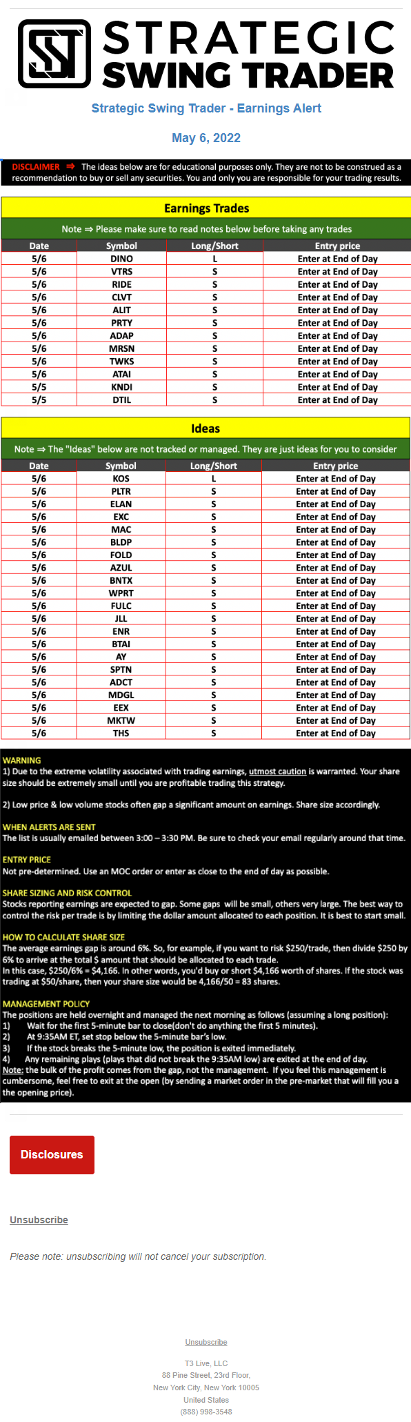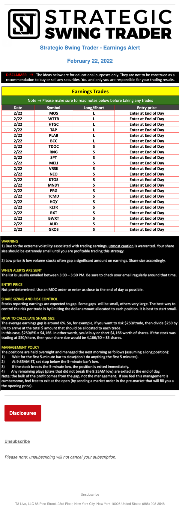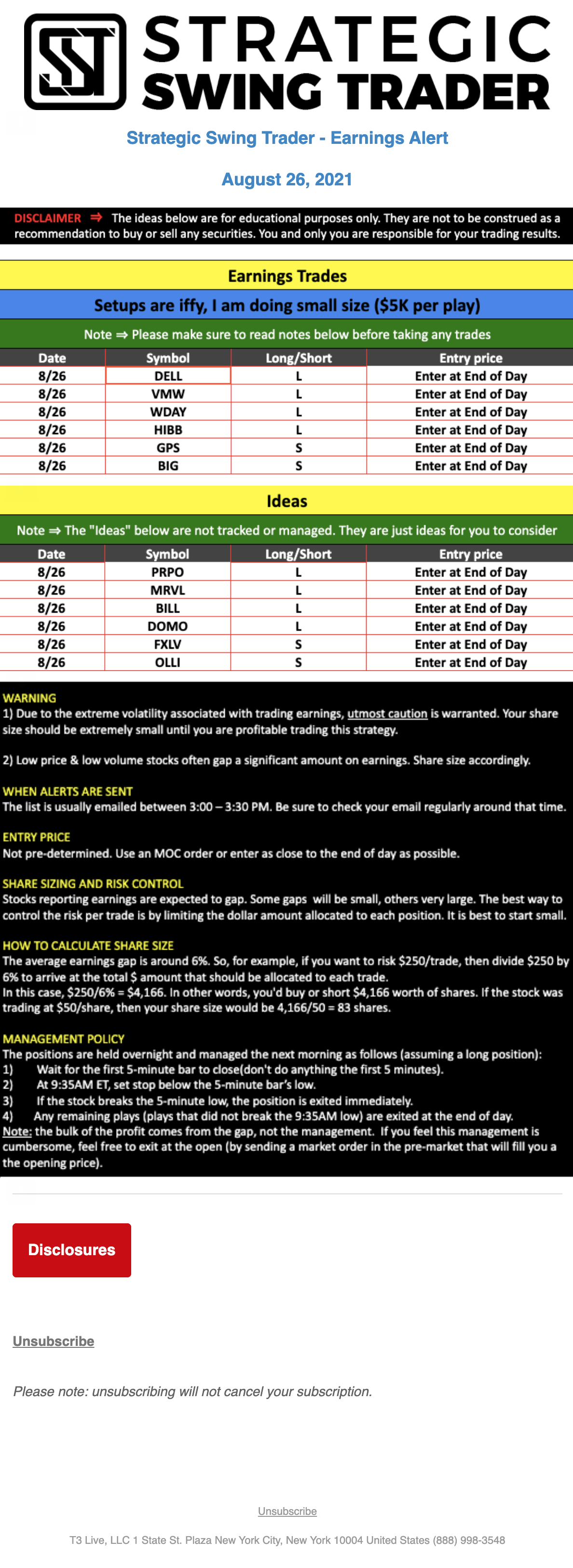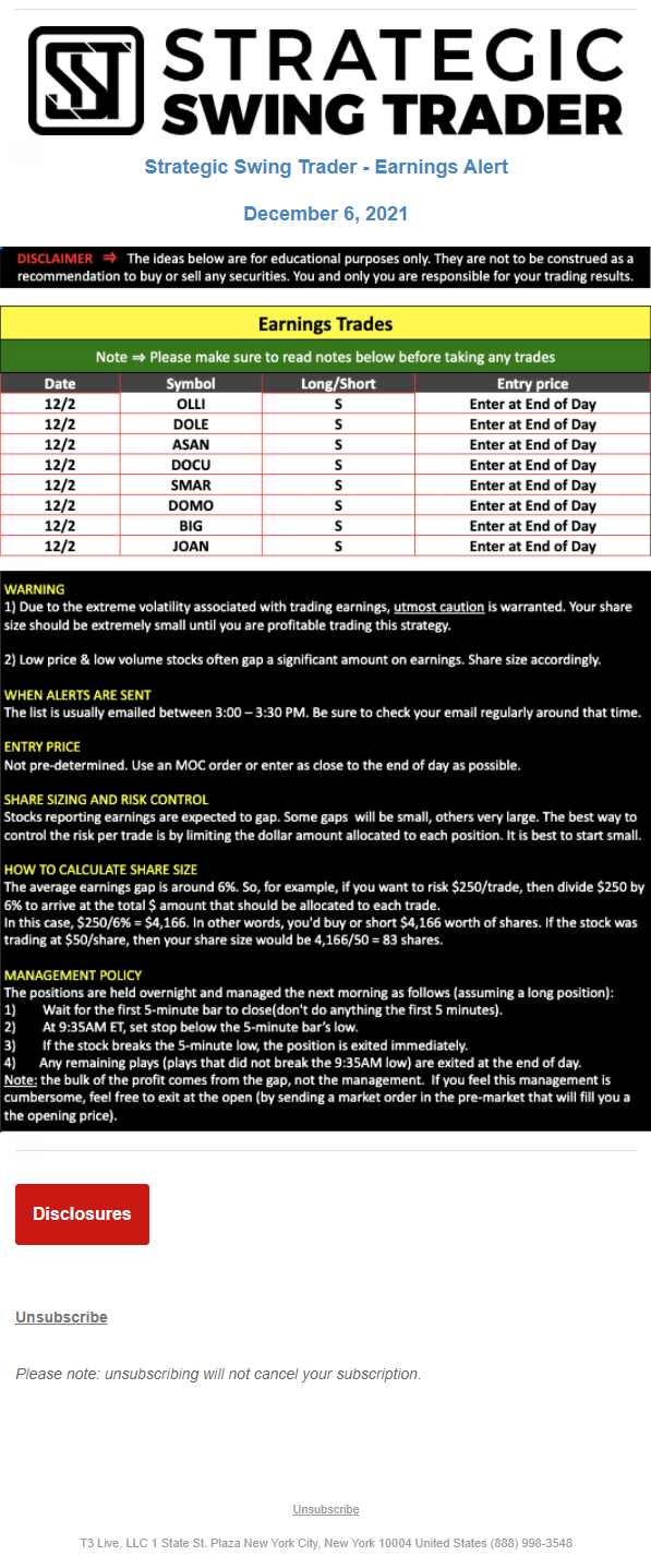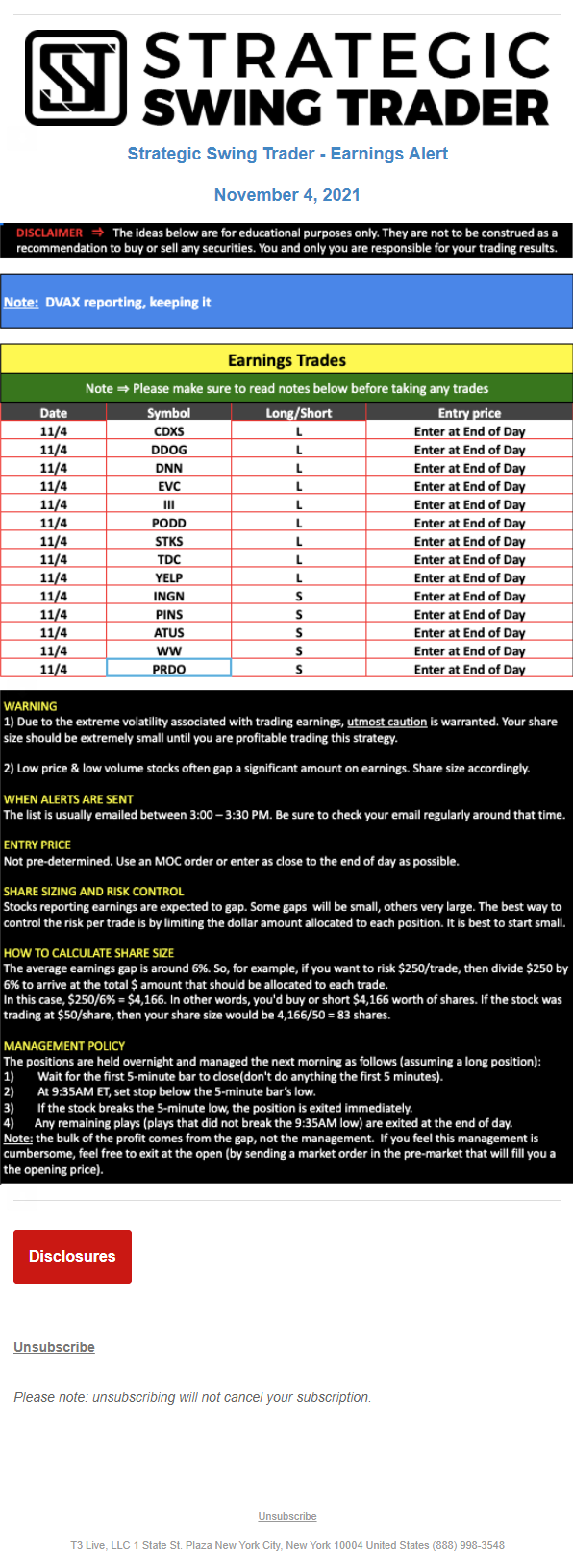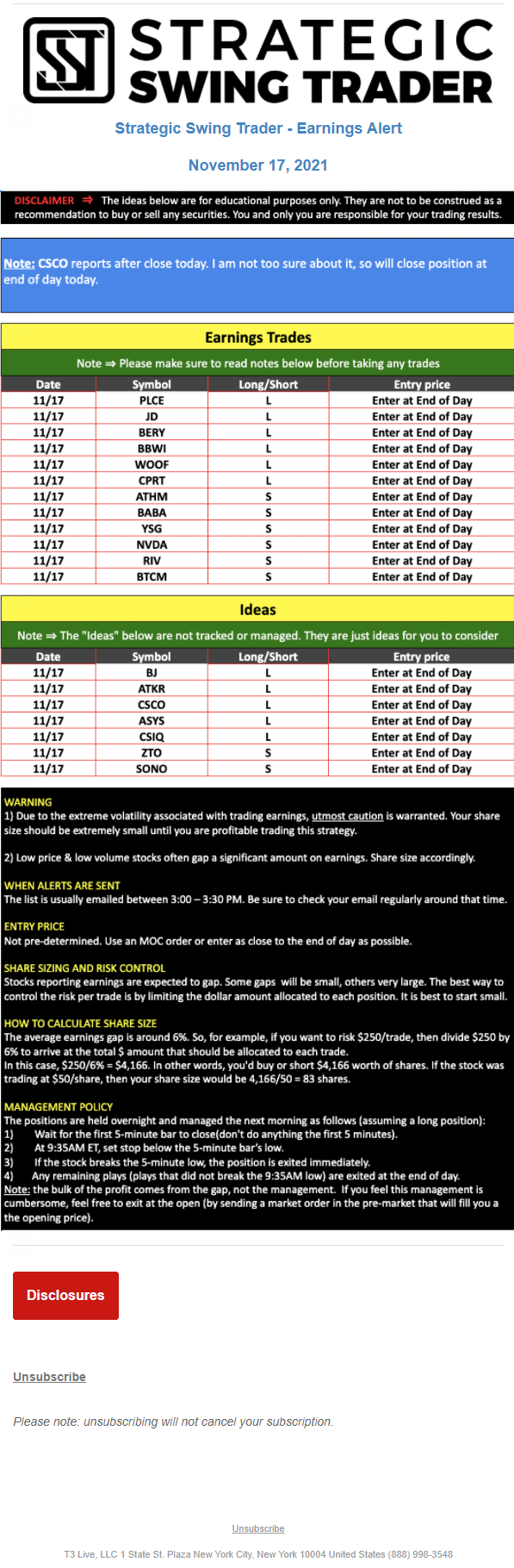 T3 Live, LLC is a financial publisher that disseminates information about economic, business, and capital markets issues through various media. T3 Live is not a Broker-Dealer, an Investment Adviser, or any other type of business subject to regulation by the SEC, CFTC, state securities regulators or any “self-regulatory organization” (such as FINRA). Although T3 Live and T3 Trading Group, LLC are affiliated companies by virtue of common ownership, the companies are managed separately and engage in different businesses.