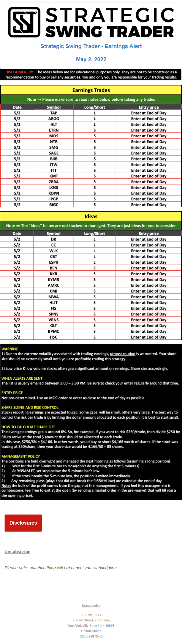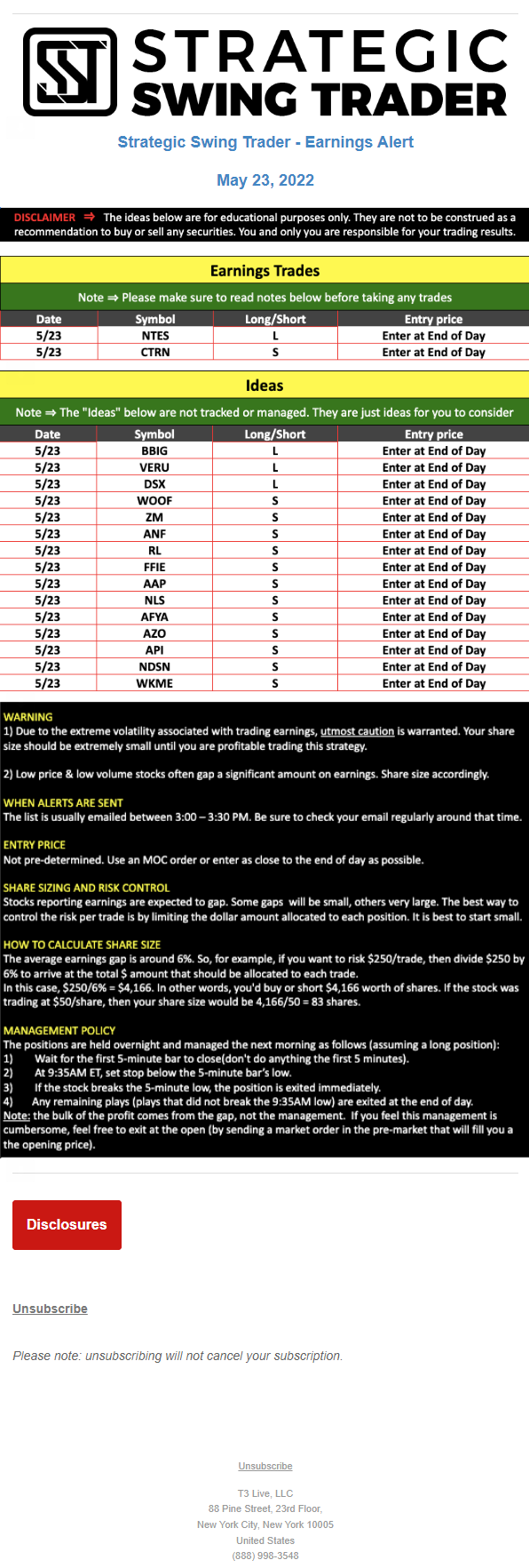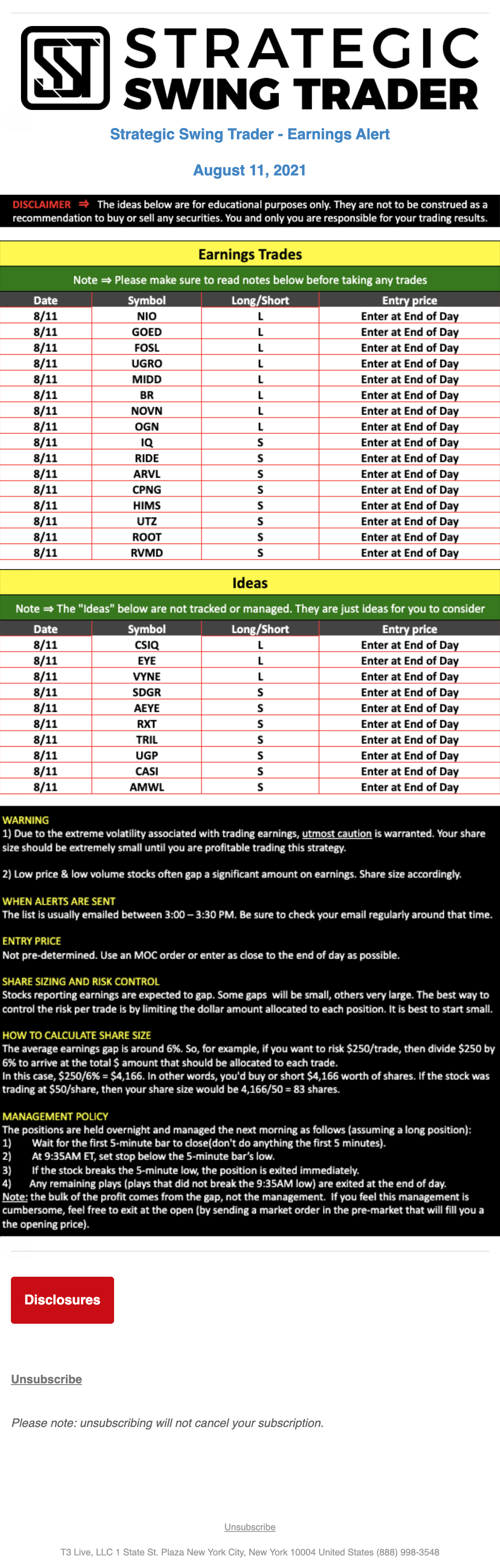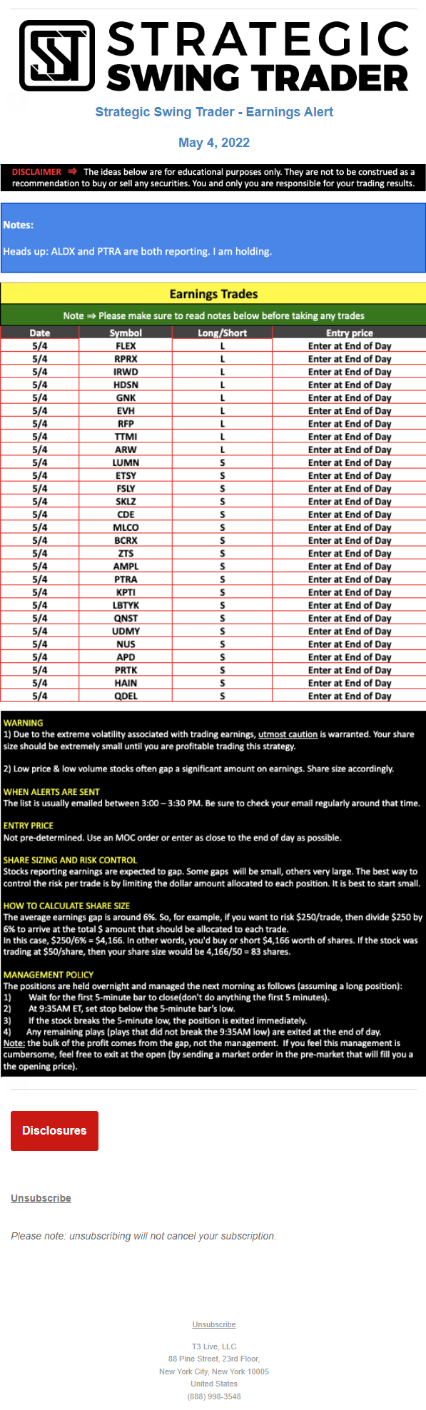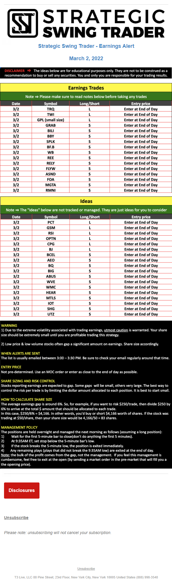 T3 Live, LLC is a financial publisher that disseminates information about economic, business, and capital markets issues through various media. T3 Live is not a Broker-Dealer, an Investment Adviser, or any other type of business subject to regulation by the SEC, CFTC, state securities regulators or any “self-regulatory organization” (such as FINRA). Although T3 Live and T3 Trading Group, LLC are affiliated companies by virtue of common ownership, the companies are managed separately and engage in different businesses.