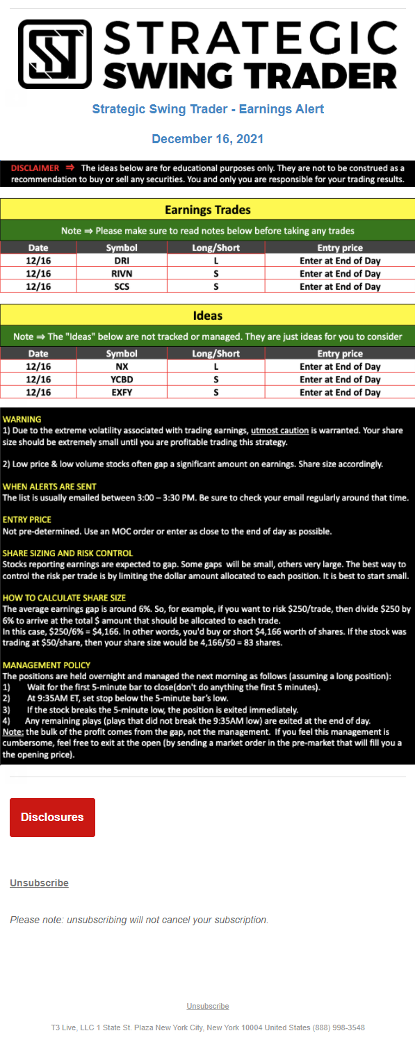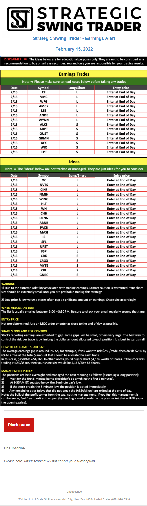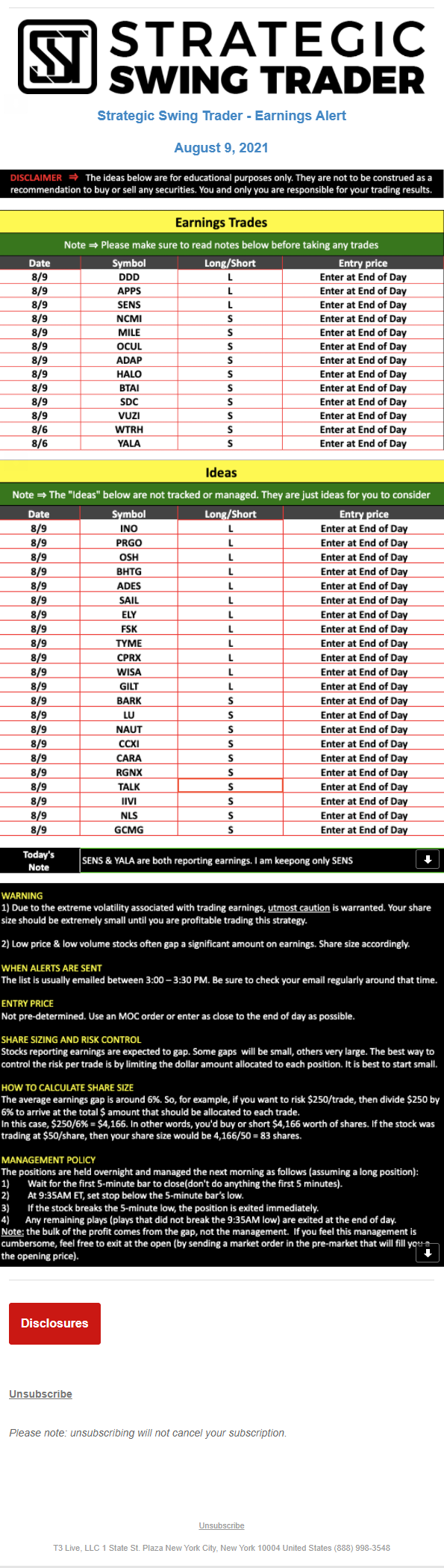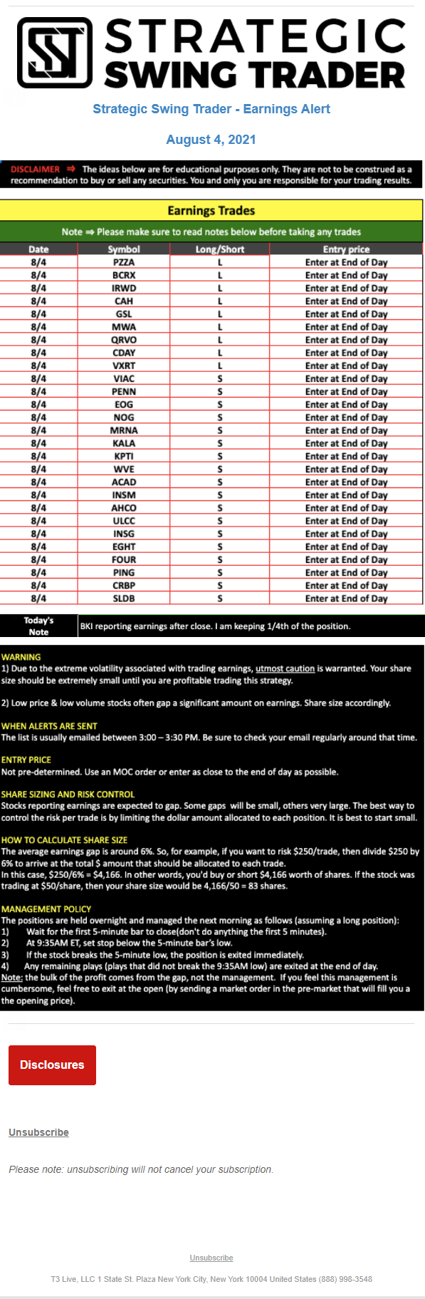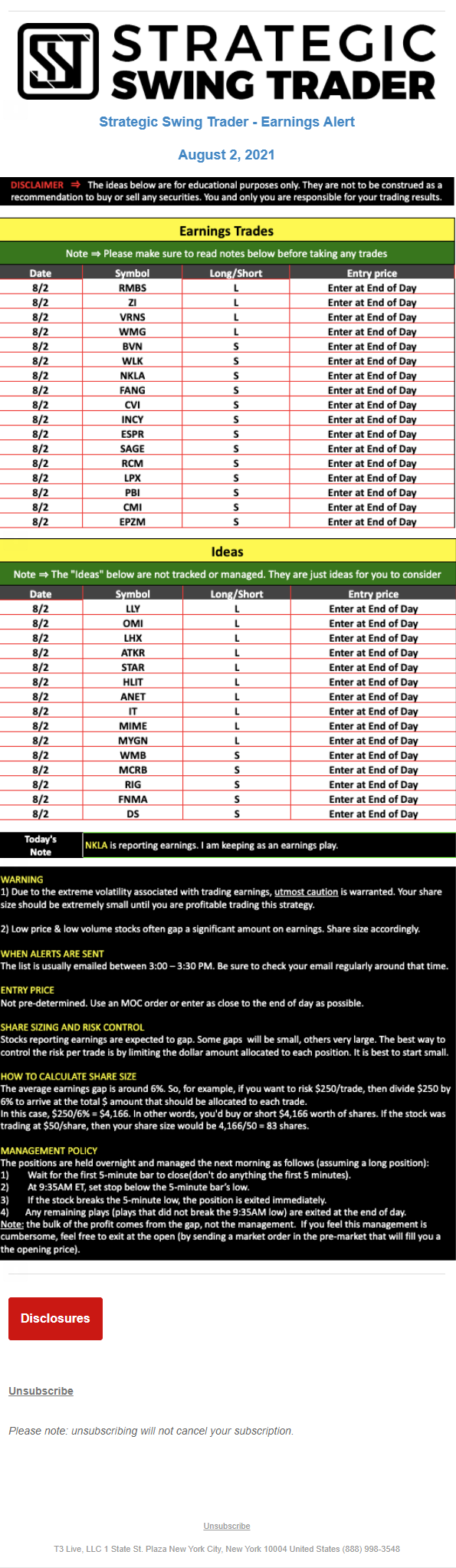 T3 Live, LLC is a financial publisher that disseminates information about economic, business, and capital markets issues through various media. T3 Live is not a Broker-Dealer, an Investment Adviser, or any other type of business subject to regulation by the SEC, CFTC, state securities regulators or any “self-regulatory organization” (such as FINRA). Although T3 Live and T3 Trading Group, LLC are affiliated companies by virtue of common ownership, the companies are managed separately and engage in different businesses.